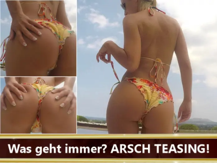Wovon kannst du nie genug bekommen? Klar: von mir, aber ganz speziell von meinem Knackarsch kannst du nie genug haben! Ganz egal, ob ich dich gerade keusch halte oder dir eine Wichserlaubnis erteilt habe: Dieses Arsch Teasing darfst und wirst du dir ansehen! Die Herrin genießt hier ihren geilsten Urlaub ever und DU darfst mich dabei ein paar Minuten bewundern und besonders meinem Po ganz nah sein! Genieße es, meine Marionette!